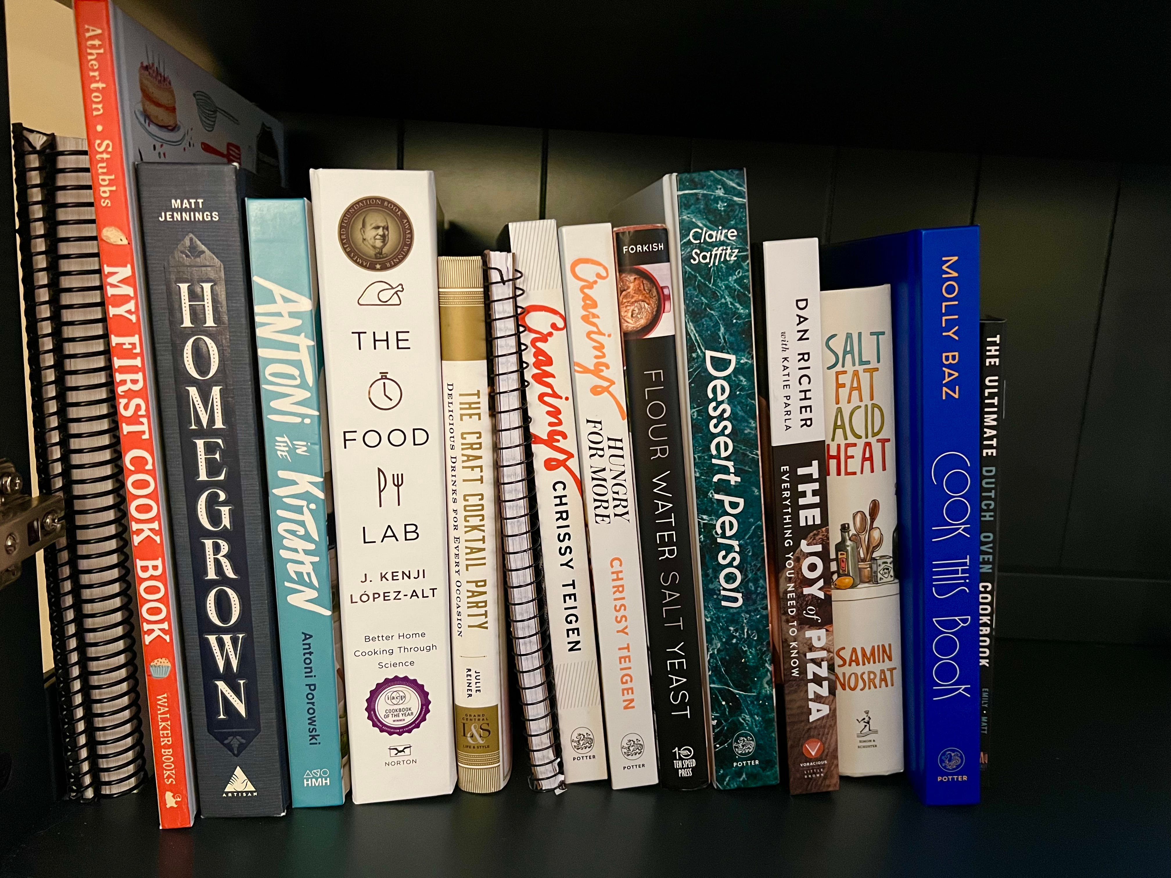 Joe: Mom's Memorable Recipes, editions one and two -- the spiral bound cookbooks in the photo above. I helped my mom make copies of her recipes and get these books bound at Kinkos when I was the only child left in my parents' otherwise empty nest. The first Christmas she gave these out to my siblings, I didn't even get my own copy. I've grown up a lot since then and have really loved working through the recipes with Claudia. It's special to be able to remember something I used to eat growing up, find it in one of the books, try to parse my mom's handwriting, and then recreate it perfectly at home.